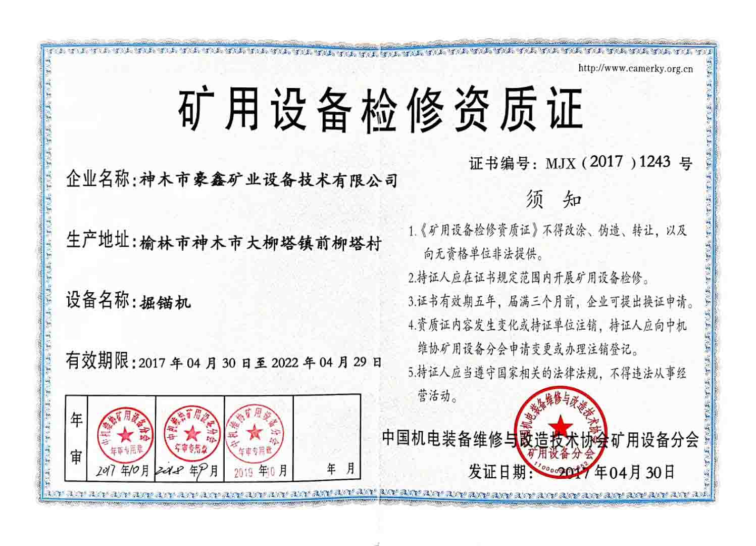 掘錨機(jī)檢修資質(zhì)證