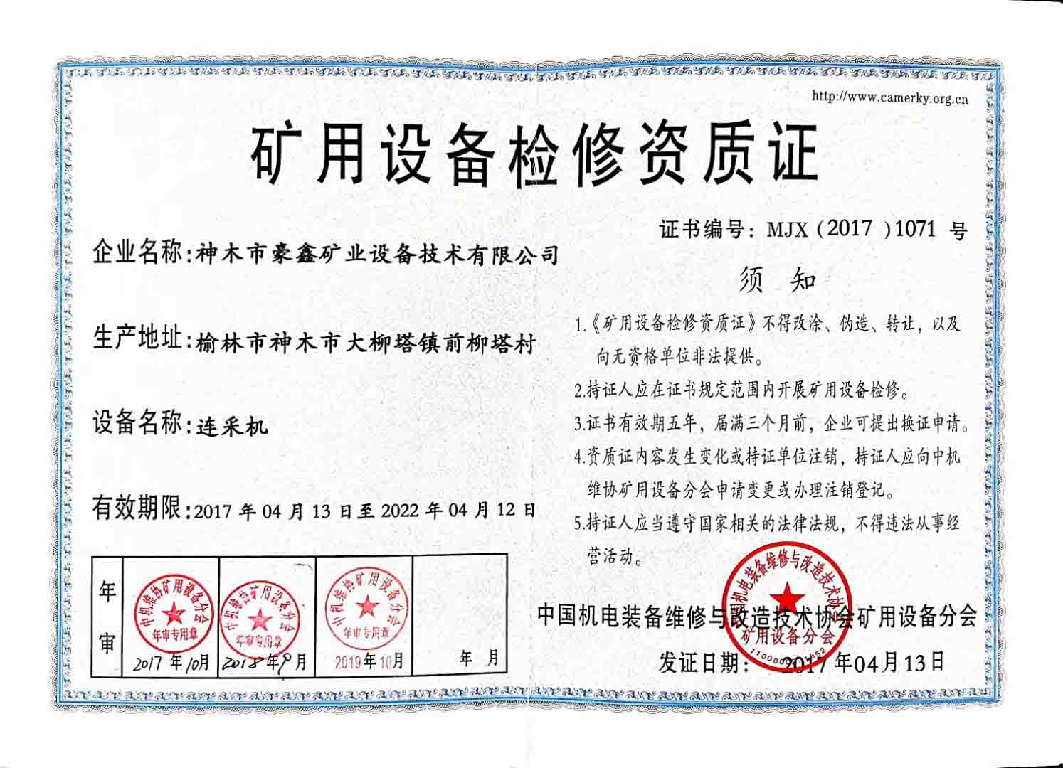 連采機(jī)檢修資質(zhì)證